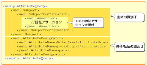 図12に示す例では主体の認証について認証アサーションを添付し、主体の資格を問い合わせている。この要求に対して図13の示す属性アサーションが返される。