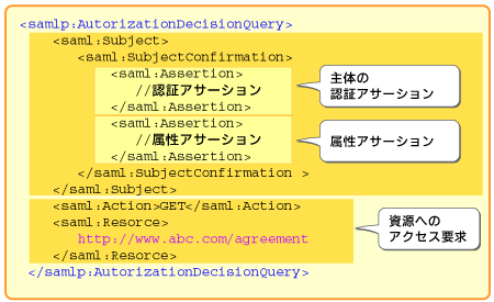 図14に示す例では認証アサーションと属性アサーションを添付して資源へのアクセスを要求している。この認可要求に対して図15の認可決定アサーションが返される。