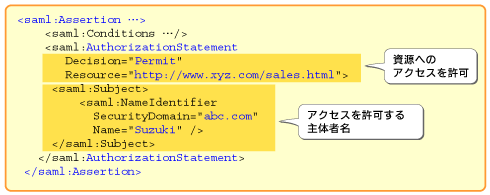 図15に示す例は、図14で示した資格属性を指定した認可要求に対して、アクセスを許可(Permit)する認可決定アサーションの例である。この例では資源へのアクセスを許可(Permit)している。要求者に権限がなければ認可決定は不許可(Deny)となる。