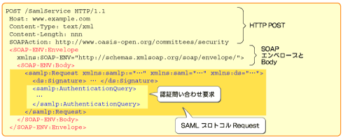 SAMLプロトコルは要求と応答の手順を定めたものである。実際のトランスポートのプロトコルはいろいろなものが使えるようにSAMLは下位のトランスポートプロトコルに独立に定めているが、1つのバインディングとしてSAML over SOAP over HTTPの仕様をOASISで定めている[SAML Bind]。