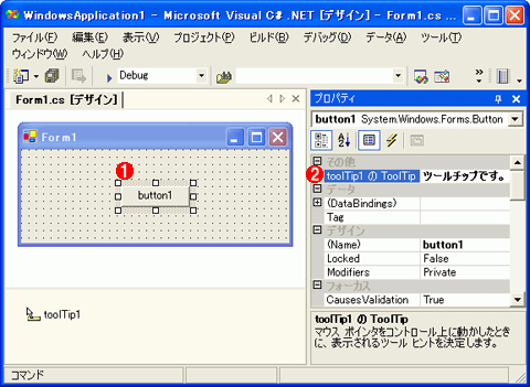 VS.NETによるToolTipコンポーネントのインスタンス化次に、インスタンス化したToolTipコンポーネント(以降、ToolTipオブジェクト)に対してツールチップの設定を行う。