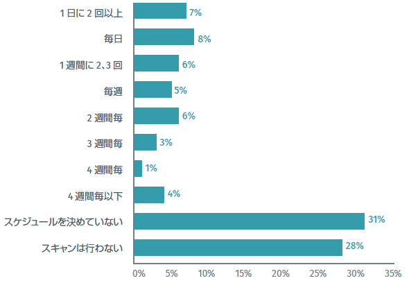 今回の調査によると、1組織当たり平均19人が脆弱性管理に参加していることが分かった。ところが、「セキュリティ部門には迅速に脆弱性をスキャンする人材が十分にいない」と答えた回答者の割合は58%に上った。実際、31%の組織では脆弱性スキャンのスケジュールを決めておらず、28%がそもそもスキャンしないと答えている。