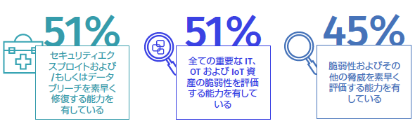 サイバー攻撃への対策として有効だと考えていることでは、セキュリティエクスプロイトの修復や、脆弱性を迅速に評価する能力が挙がった。具体的には、セキュリティエクスプロイトやデータブリーチの素早い修復と、全ての重要なIT、OT、IoT資産の脆弱性評価を挙げた回答者は、それぞれ51%(複数回答)だった。