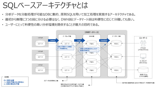 ビッグデータ解析基盤は、トランザクションベースのリレーショナルデータベースで厳格に管理されてきた売り上げや在庫データなどを分析に活用するため、大量のデータを分散してスケールアウト処理できるデータウェアハウスにバルクロードし、BI(ビジネスインテリジェンス)ツールから可視化できるようにしたものが始まりのようです。