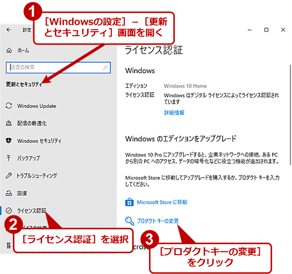 準備ができたら、[Windowsの設定]アプリの[更新とセキュリティ]−[ライセンス認証]画面を開き、「Windowsのエディションをアップグレード」欄の[プロダクトキーの変更]リンクをクリックする。または、Microsoft Storeのライセンス購入ページで「Windows 10 Proプロダクトキーを持っています」のリンクをクリックしてもよい。