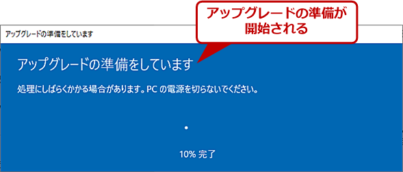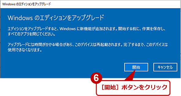 どちらの場合も[プロダクトキーの入力]ダイアログが開くので、ここで購入したWindows 10 Proのプロダクトキーを入力して、[次へ]ボタンをクリックする。アクティベーション(認証)が行われ、正規のプロダクトキーであれば、[Windowsのエディションをアップグレード]ダイアログが表示されるので、[開始]ボタンをクリックする。[アップグレードの準備をしています]ダイアログが表示され、準備ができると自動的に再起動が実行される。