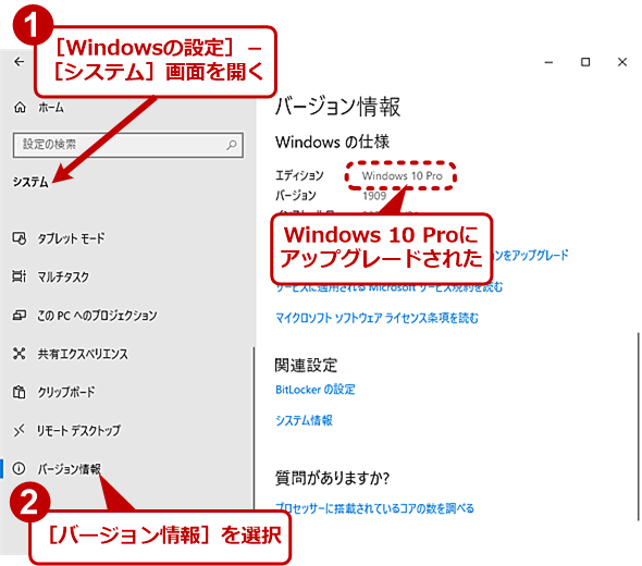 Windows 10が起動したら、[Windowsの設定]アプリの[システム]−[詳細情報]画面を見て、Windows 10 Proへのアップグレードが完了していることを確認しよう。これで、ドメインへの参加やリモートデスクトップの利用が可能になる。