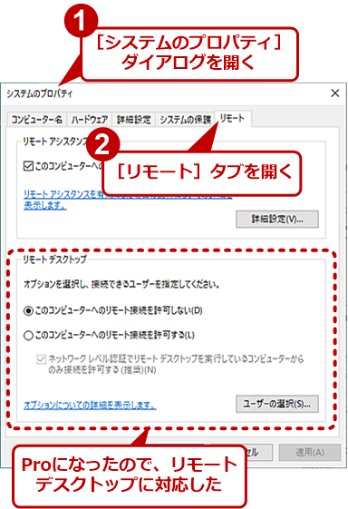 また、これまでWindows 10 Homeで十分だと思っていた会社のPCもリモートワークで、自宅から会社のPCを使うためにリモートデスクトップで接続したいといった場合には、Windows 10 Proにする必要がある。