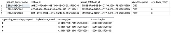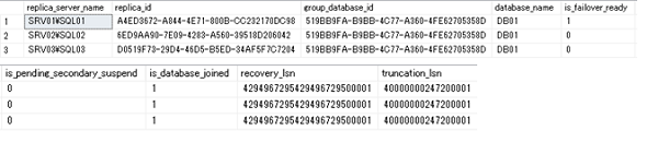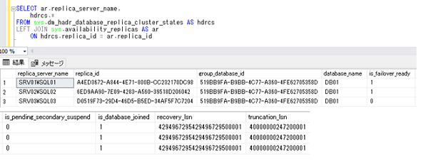 「sys.dm_hadr_database_replica_cluster_states」動的管理ビューを出力することで、可用性データベースの正常性に関する情報を出力できます。この動的管理ビューを使用して、セカンダリデータベースへのフェールオーバーの準備が整っているか、同期が中断されていないか、さらには強制フェールオーバー時の復旧ポイントなどの情報も確認できます。