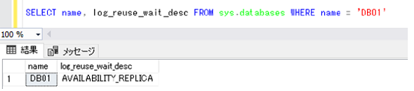可用性データベースでは、セカンダリレプリカに配布されていないトランザクションログは切り捨てられませんので、「sys.databases」カタログビューの「log_reuse_wait_desc」列の値を確認すると「AVAILABIRITY_REPLICA」となっており、ログの切り捨てを待機させる原因が可用性レプリカであることを確認できます(図5)。