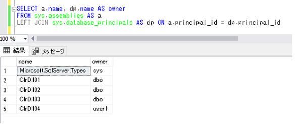 アセンブリを4つ登録し、それらを参照するユーザー定義関数を作成しました。1つのアセンブリは別の所有者に設定します(図1)。