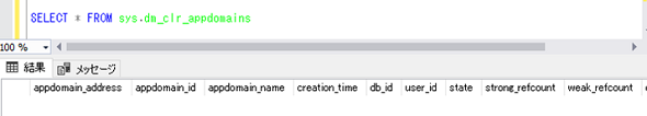 この状態で「sys.dm_clr_appdomains」動的管理ビューを出力すると、まだマネージコードを実行していないため、アプリケーションドメインは作成されておらず、何も表示されません(図2)。