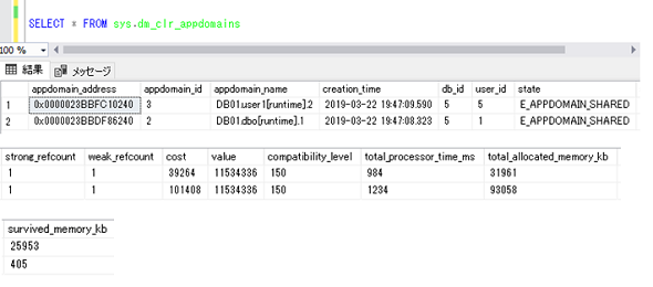 次に、多くのメモリを使用するマネージコードを繰り返し実行した後に、「sys.dm_clr_appdomains」動的管理ビューを出力します(図4)。