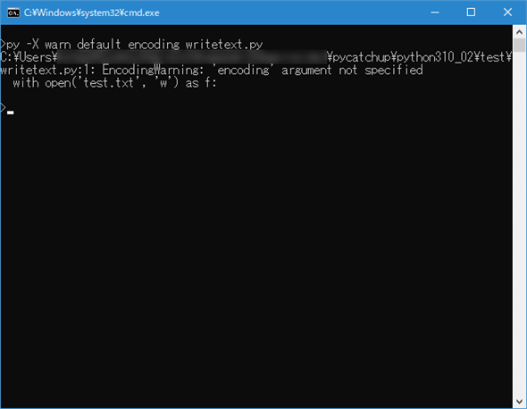 例えば、Windowsのコマンドプロンプトで上記の書き込みを行うコードを「-X warn_default_encoding」オプションを指定して実行すると、次のようになる。