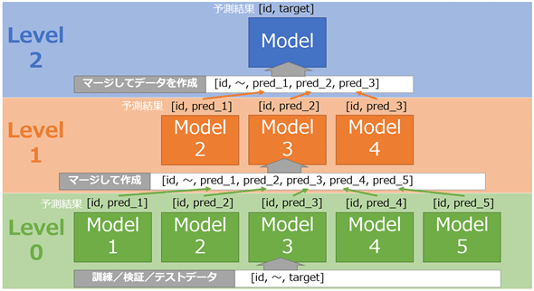 ここでのスタッキングでは、「Level 0」と「Level 1」と「Level 2」の3層の構成になるように、以下の手順でモデルやデータセットを作成していきます。