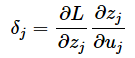 共通する計算の部分を抽出すると、次のように(今の層にあるj番目のノードにおける)δ(デルタ)の数式を定義できますね。