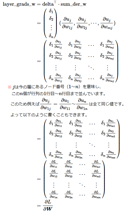 上記のような行列による計算式を組み立てる際には、掛け算や足し算の流れを追ってうまく組み立てる必要があり、特に入力の勾配の計算は頭の中が混乱してしまうかもしれません。落ち着いて組み立てていくしかありませんが、どうしても分からない場合は、基礎編での計算の流れと今回の応用編での計算の流れを逐一比較して、同じ計算内容になるかを確かめてみるとよいかもしれません。
