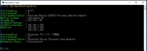 Get-NetIPConfigurationコマンドレットをオプションなしで実行すると、基本的なIP設定を取得できます(画面1)。