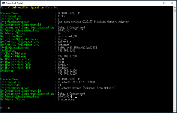 Get-NetIPConfigurationコマンドレットを「-Detailed」オプションを指定して実行すると、「ipconfig /all」コマンドと同じように、ネットワークアダプターの詳細なIP設定情報を取得できます(画面2)。
