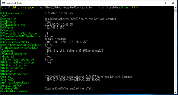 しかし、ipconfigコマンドで取得できていた、IPアドレスをリースしているDHCPサーバのアドレスやリース期間は表示できません。それらの情報を取得する場合は、「Get-CimInstance -Class Win32_NetworkAdapterConfiguration -Filter IPEnabled=$true | fl *」コマンドレットを使用します(画面3)。