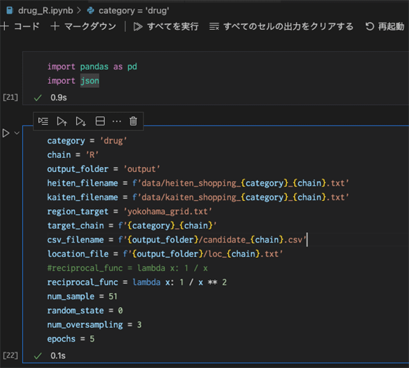 ノートブックごとに異なる設定を2カ所にまとめたので、オリジナルからコピーされた2つのノートブックでは、これらで必要な部分を変更するだけで、後はVS Codeの[すべてを実行]ボタンをクリックすれば開店場所の推測ができるようになりました。ノートブック全体に変更が必要な箇所が散らばっているとファイル全体を確認して修正をしなければならず、もしかしたら変更し忘れる可能性もあります。同じことをするノートブックを複数作成しなければならないようなときには、こんな感じで変更が必要な設定は数カ所、できれば1カ所をまとめることをオススメします。