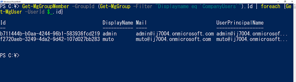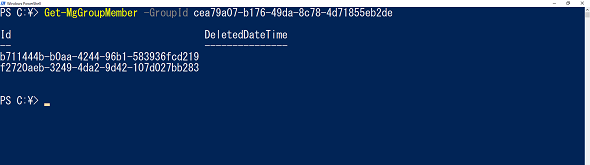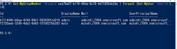 グループIDはAzure ADのグループ一覧を参照するコマンドレット「Get-MgGroup」コマンドレットで参照できます。Get-MgGroupコマンドレットとGet-MgGroupMemberコマンドレットを連続して実行することで、グループIDを調べずにグループのメンバーを参照できます(画面3)。