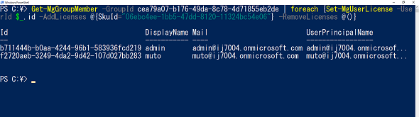 そのため、Get-MgGroupMemberコマンドレットでグループのメンバーを参照し、その結果に基づいて本連載54回で解説した「Set-MgUserLicense」コマンドレットを実行すれば、グループのメンバーに対してまとめてライセンスを割り当てることができます(画面4)。