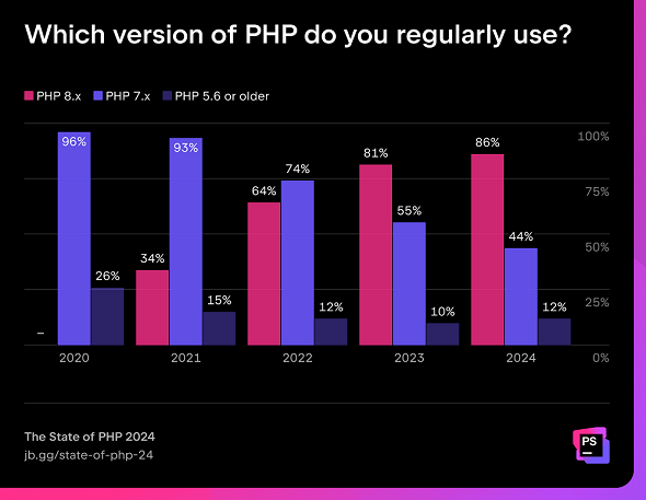 2024年にはPHP開発者の86%がPHP 8.xを使用していた。PHP 8.0は2020年11月にリリースされており、この調査の実施時期までの経過期間は3年半強だった。
