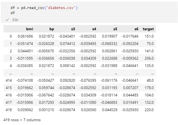 回帰分析とは何らかの変数の値を基に、それとはまた別の変数の値を予測する手法のことです。基となる変数を特徴量とか説明変数と呼びます。また、予測する変数のことをターゲットとか目的変数と呼びます。特徴量とターゲットはどちらかというと機械学習の世界でよく使われ、説明変数と目的変数は数学(統計学)の世界でよく使われます。今話題にしているDiabetesデータセットではtarget列を除く他の列が特徴量(説明変数)で、target列がターゲット(目的変数)に相当します。