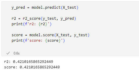 あるいはLinearRegressionクラスのscoreメソッドにテストデータ(ターゲット)と予測結果(y_pred)を渡しても同じ結果が返されます。