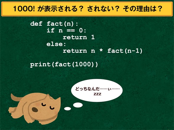 以下に示すfact関数はパラメーターnに渡された整数値の階乗を返す。最後の行では、1000を指定してこの関数を呼び出している。この関数は1000の階乗を返す(そして、print関数がそれを表示する)だろうか? 返さないだろうか? 返さないとしたらその理由は何だろう(Pythonの実行環境の設定は特に変更していないものとする)。