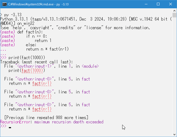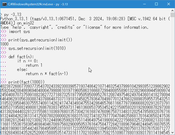 手元の環境(macOS、Windows 10)用のCPythonではgetrecursionlimit関数の戻り値は1000です。つまり、最大の再帰の回数は1000回になりますね。「最大の再帰回数が1000で、1000の階乗を計算しようとしているんだからギリ何とかなるんじゃない?」と思う人もいるかもしれません。が、恐らく、対話環境が起動するまでにスタックが既に消費されているようで、「fact(1000)」呼び出しは筆者の手元の環境ではどちらでもRecursionError例外が発生しました。
