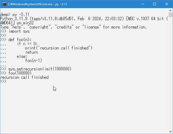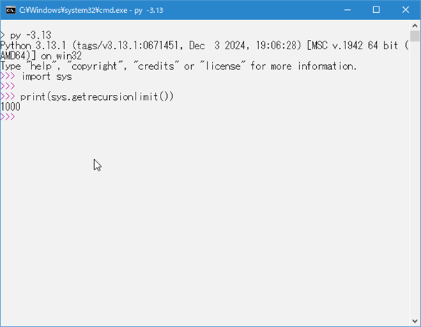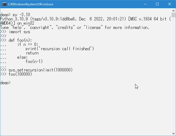 何も言わずに、プロンプトがPythonの対話環境ではなく、コマンドプロンプトのものになっている点に注目してください。これは、setrecursionlimit関数で設定した上限に届くよりも前にスタック領域を使い果たしてしまって、その結果、Python処理系そのものが落ちていることを示唆しています(macOSやUNIX系統のOSならsegmentation faultが発生するでしょう)。