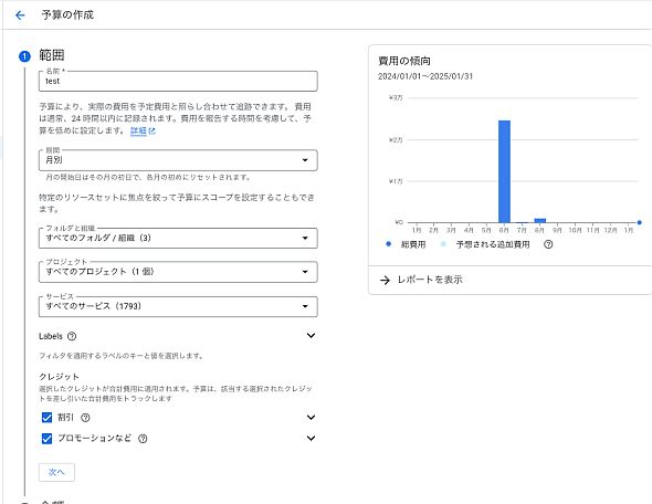 まず、管理対象範囲を設定します。対象のプロジェクトを選択し、割引やプロモーションを差し引くかどうかを設定できます。毎月の利用量を把握したいのであれば、割引やプロモーションのチェックを外します。支払金額を把握したいならば、そのままにしておきましょう。