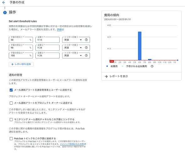 最後にアラートを送るタイミングと通知の設定です。設定した予算に対する割合を、自動的に計算してくれます。要らない場合は削除してしまいましょう。