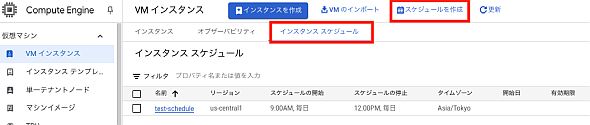 Compute Engineの画面のインスタンススケジュールタブからスケジュールを作成ボタンを押すと設定できます。