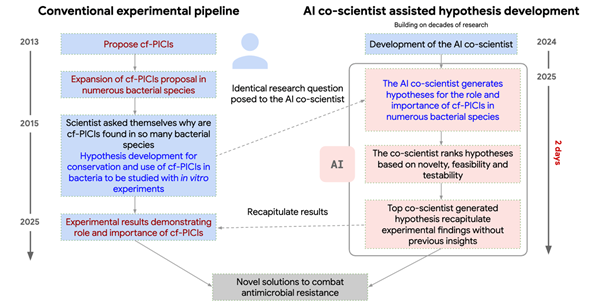 このテストでは、専門研究者がAI Co-Scientistに対し、自分たちのグループ内では既に新たな発見の対象となっているものの、まだ一般には明らかにされていないトピックを探求するよう指示した。それは、カプシド形成性ファージ誘導性染色体島(cf-PICI)が、異なる細菌種にどのように広がるのかという仕組みの解明だった。AI co-scientistシステムは、cf-PICIが多様なファージ尾部と相互作用して宿主範囲を拡大することを独自に提案した。