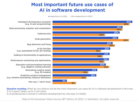 両グループとも、ソフトウェア開発におけるAIの将来的な最も重要なユースケースとして、インテリジェント開発アシスタントやデータ処理、分析、視覚化を挙げている。