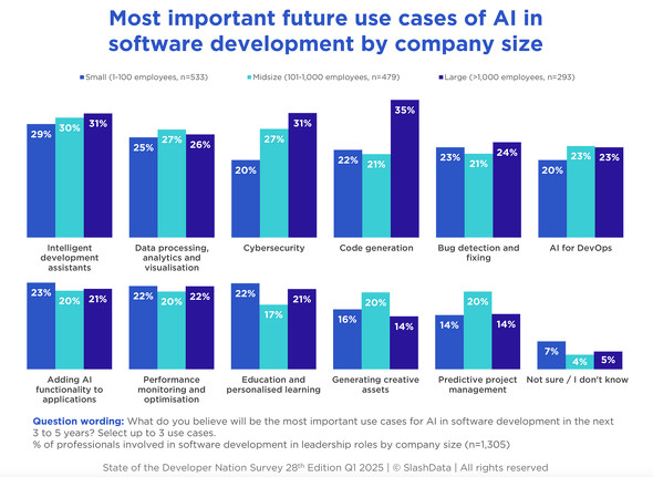 「企業規模別で見ると、インテリジェント開発アシスタントなどのユースケースの重要性はほとんど変わっていない。大企業か中小企業かを問わず、開発者は、AIが有用であると期待している。日常的なコーディング作業はAIに任せることで、開発者がより戦略的な役割を担い、大局的な視点に集中できるようになるだろう」(SlashData)