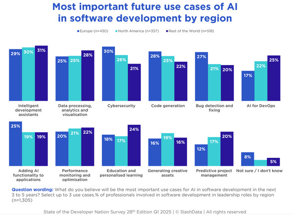 SlashDataは、AIがソフトウェア開発に与える影響や、テクノロジーリーダーやソフトウェア開発者がAIのユースケースとして重視している分野を企業規模別、地域別に調査した結果を発表した。