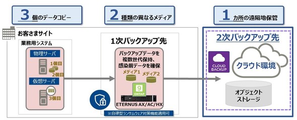 Cloud Backupは、ETERNUS AX/AC/HX seriesに保存したデータのバックアップをパブリッククラウドベンダーのオブジェクトストレージに自動的に保存する機能だ。ユーザー企業が遠隔地拠点を持っていなくても、クラウドサービスをバックアップサイトとしてすぐに利用できる。