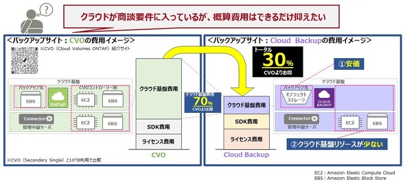 「お得に」という点では、CVOを使ってバックアップサイト(迅速なデータリカバリーが可能な災害対策サイト)を構築するのに比べると、クラウド基盤費用は約70%削減でき、トータルでも約30%のコストダウンが見込めるという。