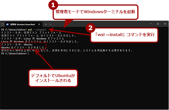 WSL2のインストールが完了すると、Ubuntuのインストールの準備が実行され、再起動が要求される。再起動後、自動的にWindowsターミナルが起動し、Ubuntuのダウンロードとインストールが実行される。Windowsターミナルが起動するまで時間がかかることがあるのでしばらく待つこと。