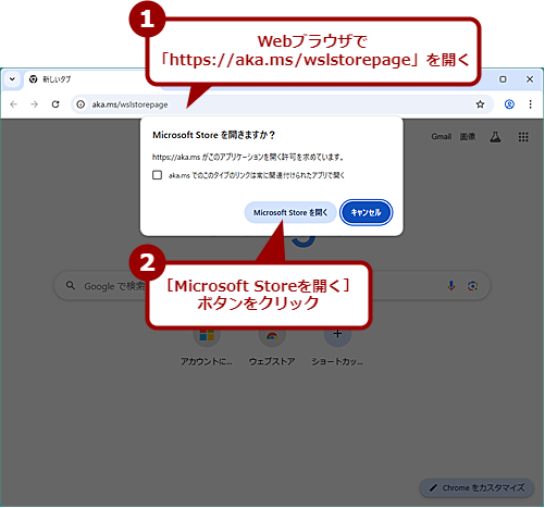 ただし、「Microsoft Store」アプリの検索入力ボックスに「WSL」や「Windows Subsystem for Linux」と入力して検索しても、WSL2が検索結果に表示されないようだ。Microsoft Storeからインストールするには、Webブラウザに以下のURLを入力し、「Microsoft Storeを開きますか?」と表示されたら、[Microsoft Storeを開く]ボタンをクリックする。なお、「https://aka.ms/」はMicrosoftのダウンロードページなどへのリンクに使われるURLだ。