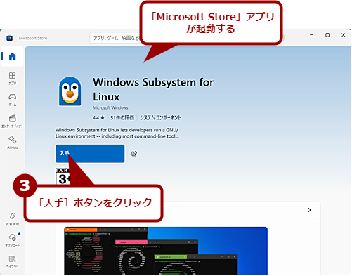 そのLinuxディストリビューションをインストールしたい場合は、[入手]ボタンをクリックする。