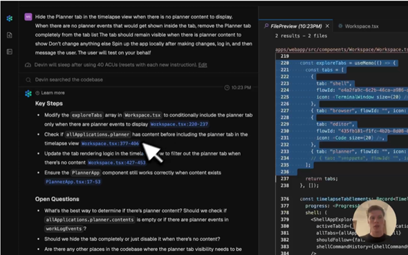 セッションを開始するたびに、Devinが数秒で関連ファイルや調査結果、初期プランを提示する。ユーザーはこれを調整することで、Devinのタスク理解が自身の意図と一致しているか確認し、必要に応じて作業を任せることができる。