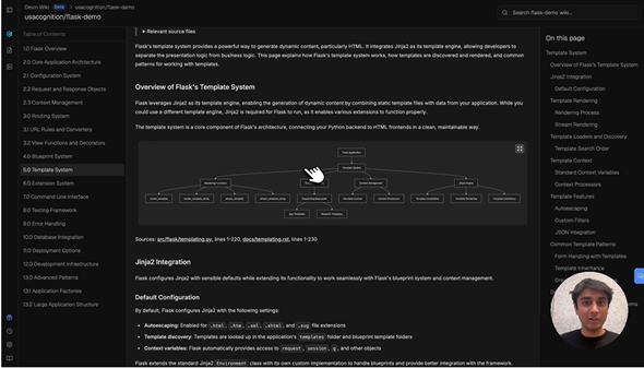 Devinは数時間ごとにリポジトリを自動インデックス化し、アーキテクチャ図やソースへのリンク、ドキュメントなどを含む詳細なwikiを生成する。