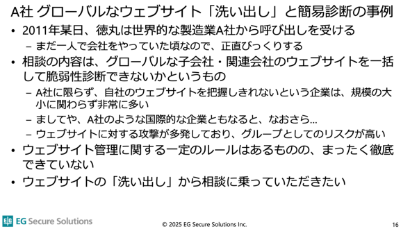 次に徳丸氏は、自身の経験談を述べる。徳丸氏は2011年ごろ、とある製造業のグローバル企業から、子会社や関連会社のWebサイトを、一括して脆弱性診断したいという要望を受けた。動機は、ASMそのもの。部門単位で公開したWebサイトの存在も否定できず、把握できていないアタックサーフェスを把握したいという。