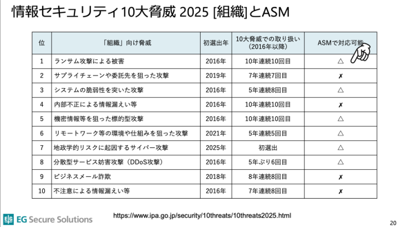 毎年公開される「情報セキュリティ10大脅威」の2025年版でピックアップされた、組織における10の脅威を対象に、徳丸氏は独自でASMで対応可能かどうかをチェックした。10大脅威の半数程度はASMが何らかの形で効果があるとしつつ、中でも注目したいのは「ランサム攻撃による被害」への効果だ。