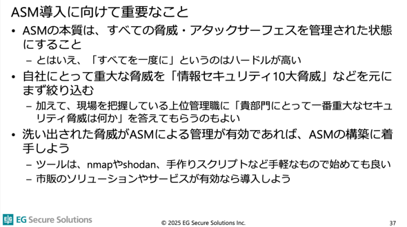 「たくさん答えてもらう必要はない。一大脅威、三大脅威くらいにとどめて、特に重要なものを洗い出してもらう。重要な脅威が分かり、その脅威がASMによる管理が有効なら、構築に着手しよう。その際、サービスや製品の導入が必要とは限らず、『Nmap』(オープンソースの著名なポートスキャンツール)によるポートスキャンや手作りスクリプト、Shodanでもよい」(徳丸氏)